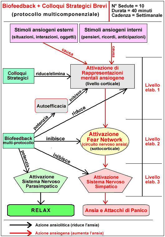 Nella tabella sottostante è illustrato lo schema di funzionamento di un protocollo multicomponenziale non-farmacologico che fa uso del biofeedback e di colloqui strategici brevi: questi ultimi permettono di individuare le cause principali dell'ansia e di definire col paziente le strategie d'azione più efficaci. Contemporaneamente il biofeedback agisce sia riducendo/eliminando i sintomi somatici e cognitivi dell'ansia, sia potenziando il senso di autoefficacia dell'individuo, rendendolo capace di controllare/eliminare sul nascere sia l'ansia basale sia le crisi d'ansia o di panico: